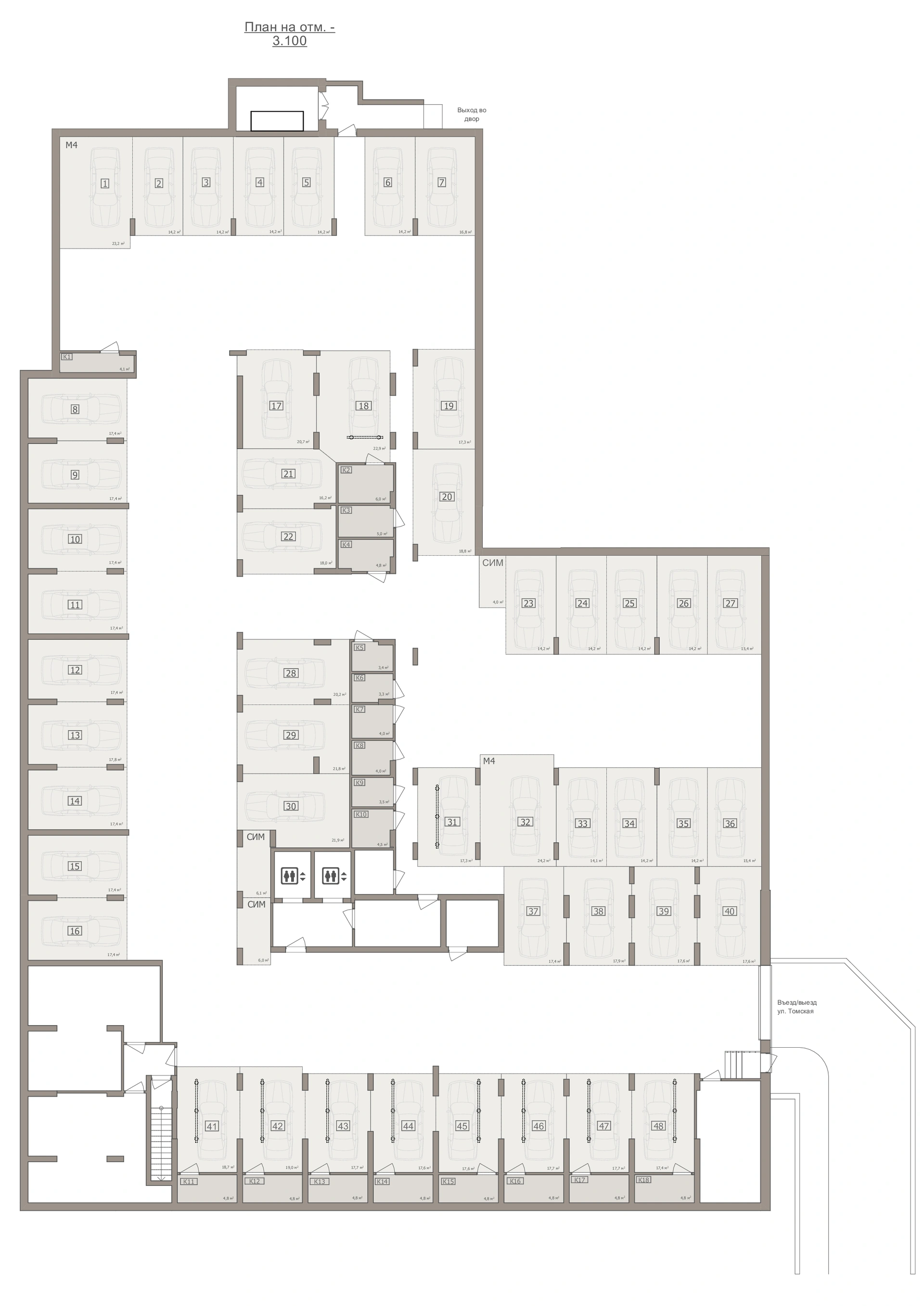 Под домом предусмотрен подземный одноуровневый паркинг на 48 машино мест. В паркинге спроектированы расширенные (14–16 м²) и стандартные машиноместа (12,5–13 м²).